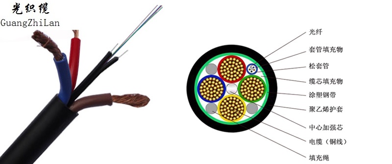 光電混合光纜的結(jié)構(gòu)是將 250μm 光纖套入高模量材料製成的松套管中,松套管內(nèi)填充防水化合物。纜芯中心為FRP或金屬加強(qiáng)件(有些結(jié)構(gòu)需在加強(qiáng)件加一層PE墊層)。電線與松套管(和填充繩)圍繞中心加強(qiáng)芯絞合成緊湊和圓形的纜芯,纜芯內(nèi)的縫隙充以阻水填充物。雙面涂塑鋼帶(PSP)縱包后擠制聚乙烯或低煙無鹵(LSZH)護(hù)套成纜。